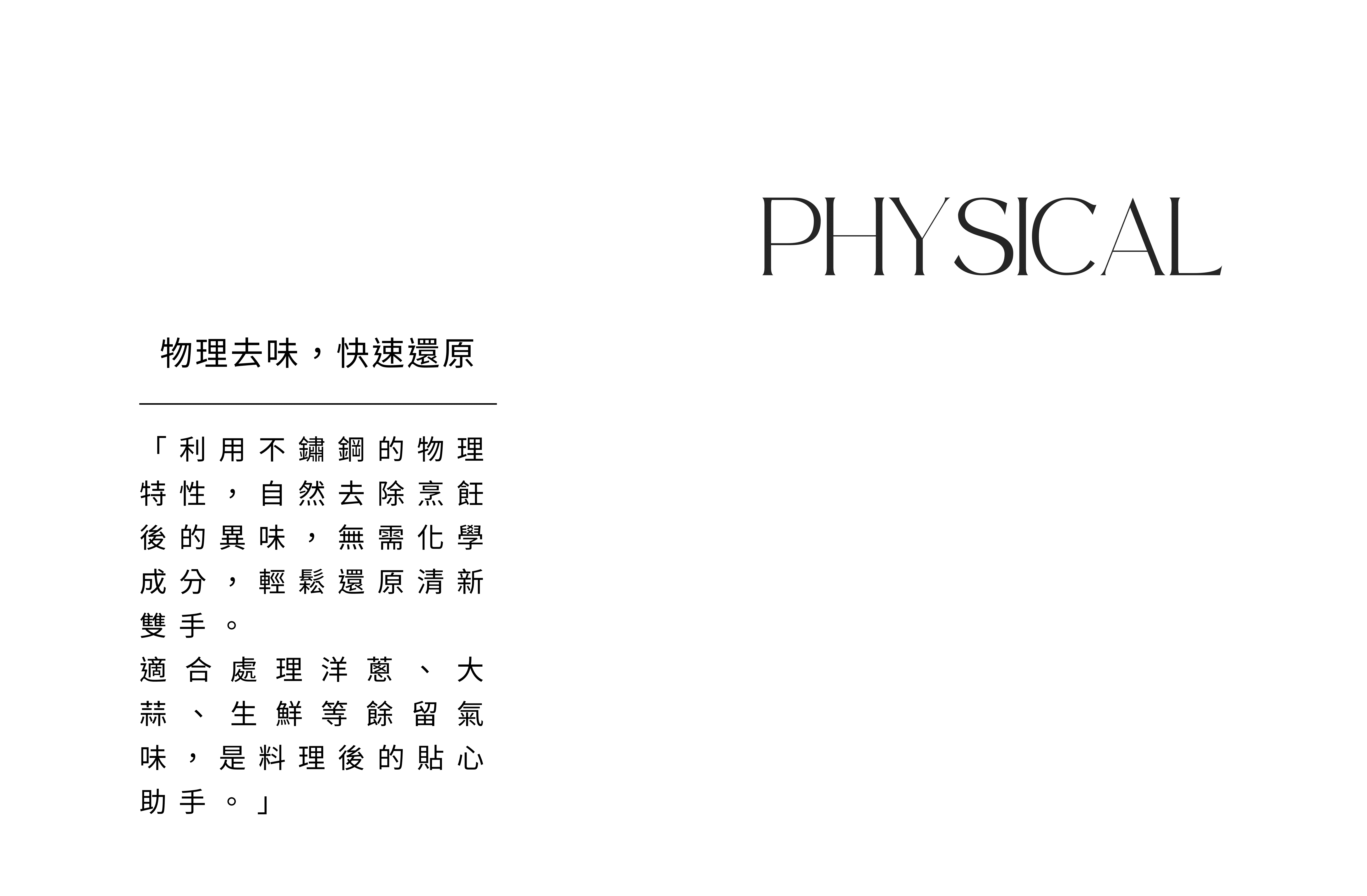 去除異味 | 有效去除因烹飪或食材處理後餘留於手部及皮膚上的氣味,例如洋蔥、大蒜、海鮮、肉類等氣味。
